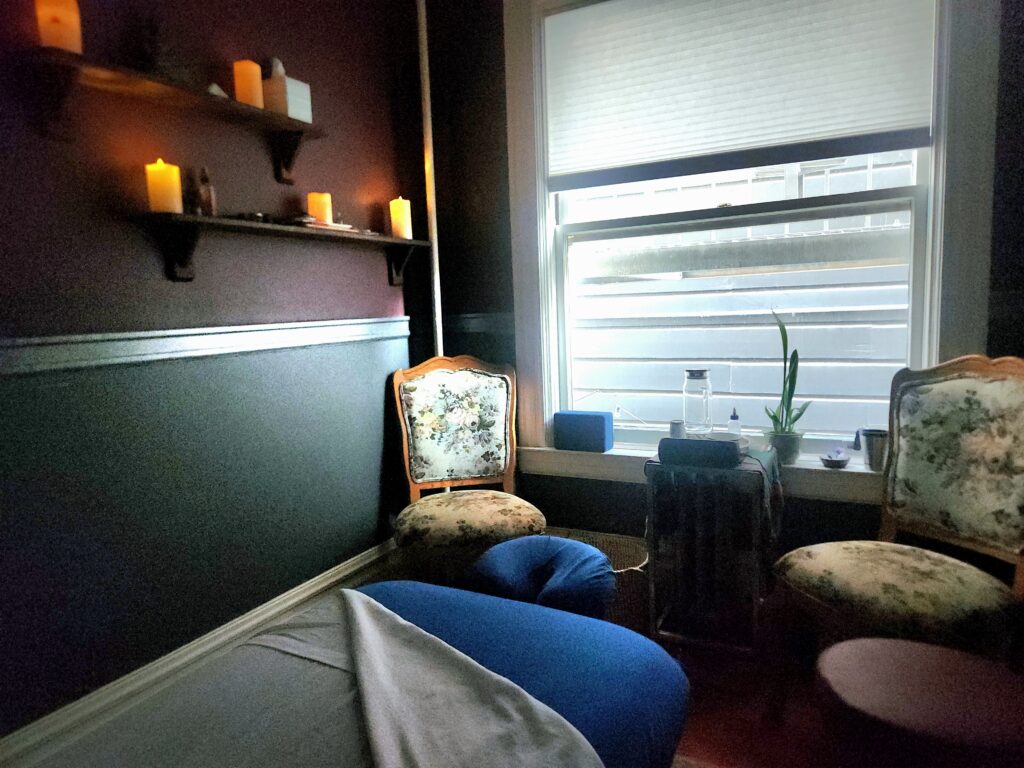 bright, breezy space with natural lighting, highlighting art nouveau features of an authentically San Franciso Victorian reconstruction. This office provides the perfect balance of energies: Serene and alert. Awake and calm. Grounded and vital. It’s a fantastic space for any session – relaxing, therapeutic, or both.